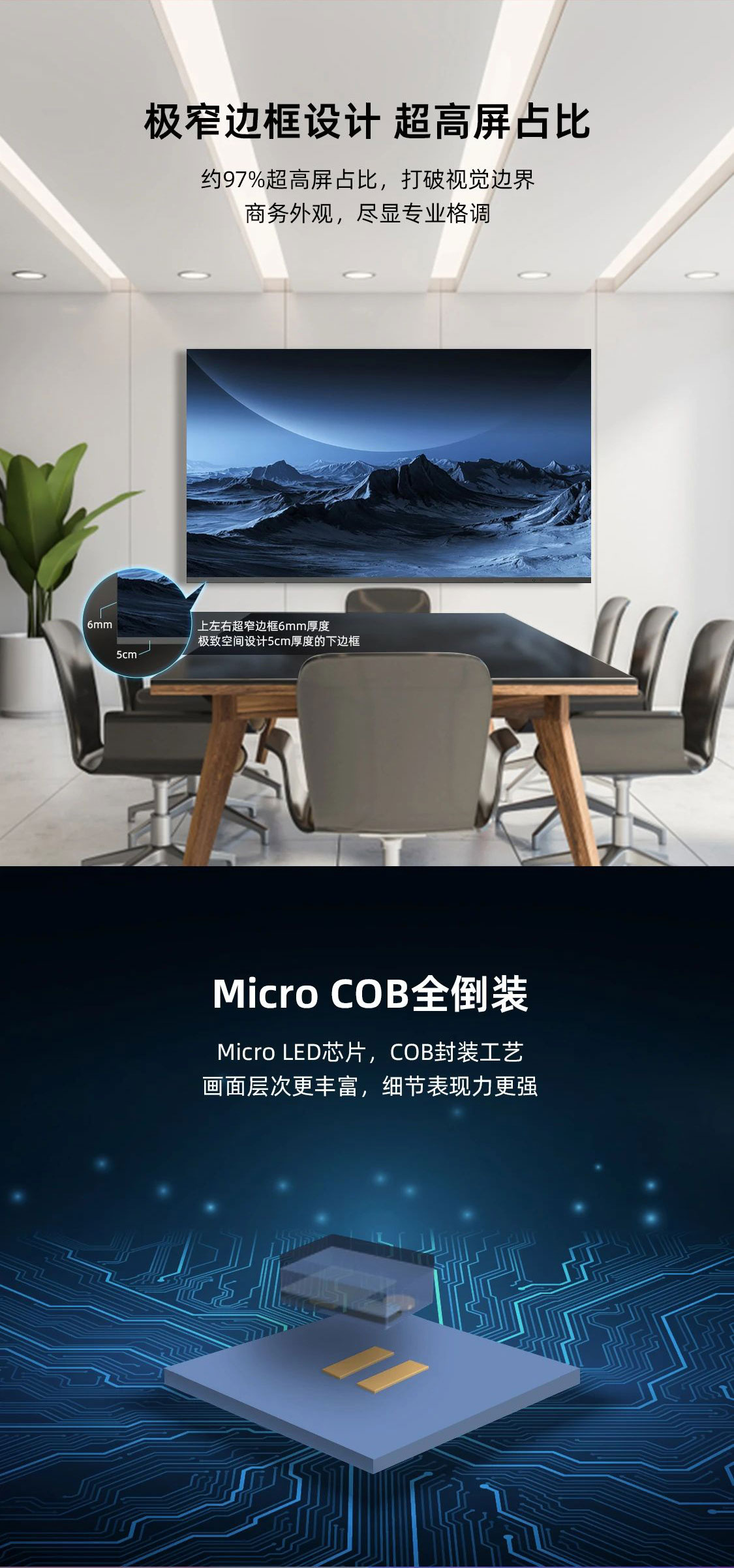 xkty.com星空新一代COB智能LED显示终端,采用先进的COB封装工艺,色彩表现卓越,呈现细腻逼真的画面效果,其“All-in-One”高度集成设计及窄边框、超高屏占比,打破视觉边界,满足会议、教育、商业展示及高端家用等多种空间场景需求。
